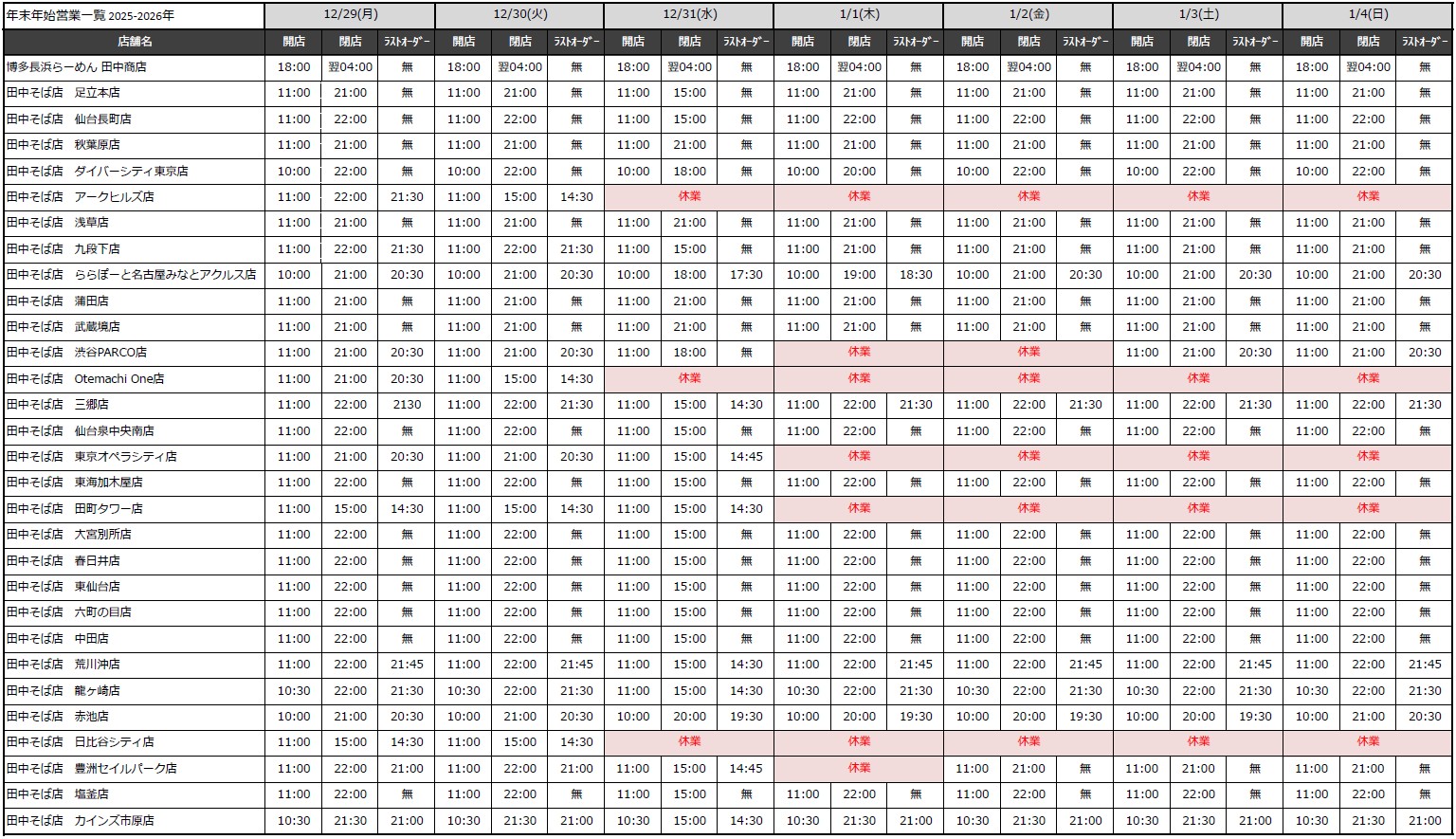 【2025年~2026年】年末年始営業時間のお知らせ 2025.12.03 INFO 全店舗 日頃から田中商店・田中そば店へのご来店誠にありがとうございます。 2025~2026年の年末年始営業時間につきましてお知らせ致します。 期間中はご不便をおかけいたしますが、何卒ご了承下さいますよう、お願い申し上げます。 ※営業時間は状況により変更になる場合がございます。予めご了承下さい。
